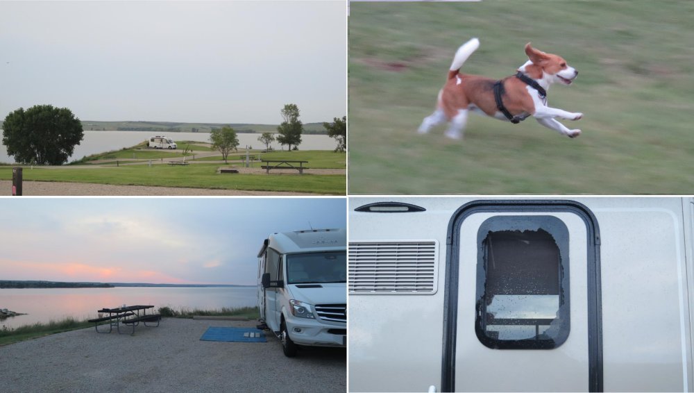 Minooka Park Recreation Area is a Corps of Engineers campground on Wilson Lake almost exactly in the middle of Kansas. Our site was on a point overlooking the lake and since we were the only ones in the area, we decided to let Luna run free for a while. Several hours after sundown the wind began to pick up and since we had left our shoes outside, I firmly grabbed the door handle and opened it to retrieve our shoes. Suddenly, the wind really increased and actually pulled me outside, which in itself wasn't a disaster but the door slammed against the outside wall of the RV. The wall wasn't damaged but the door window glass shattered. Fortunately we were on our way to the factory in Winkler and I contacted them about replacing the window.