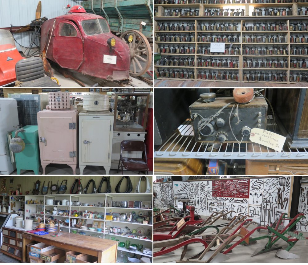 There was a collection of machines from a snow plane with skies and a small airplane engine that was built by Dale Hawn in the early 1940s, 1130 Blow Torches, compressor topped refrigerators, early home radios, a small general store and a variety of hand powered farm implements.