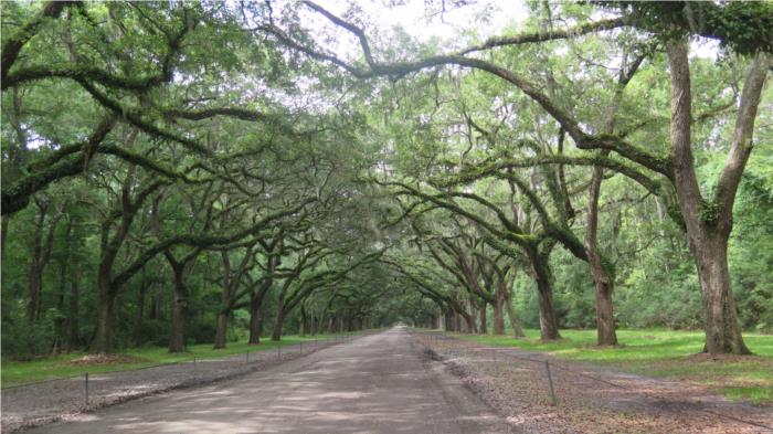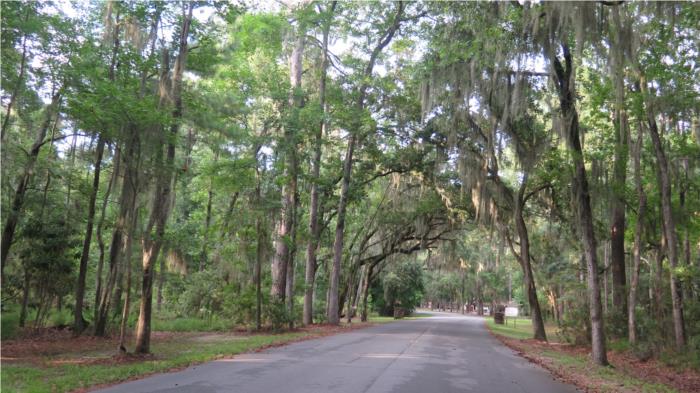 A grand entrance to the plantation that looks like something out of Forrest Gump with a road that was last graded in 1773.