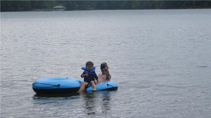 Micah had brought a couple of tube floats and he and Yoshi decided to float from our campsite about a half mile around to the campground "beach"