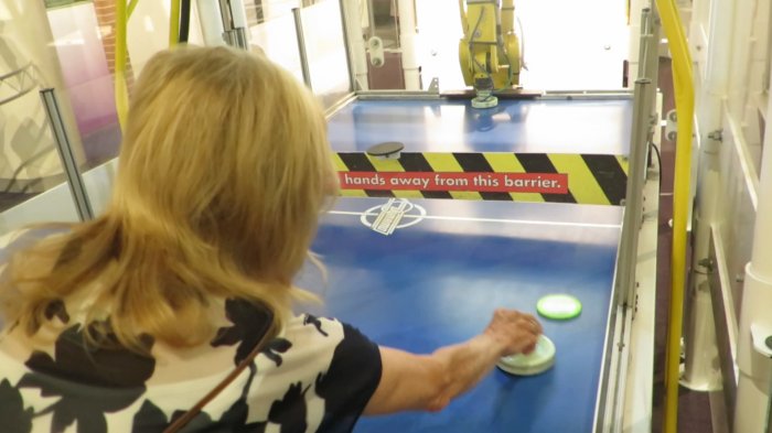 A robot that could shoot a basketball, made most shots and many interactive displays such as playing air hockey against a robot. Very hard to win.