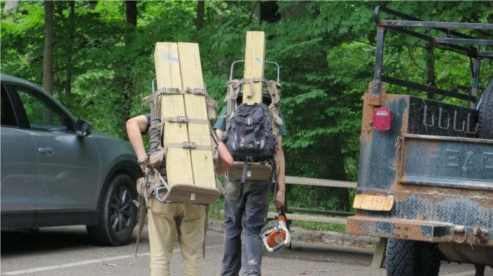The trails are maintained by workers who carry in the replacement 4"x4" posts for repair of some stairs.