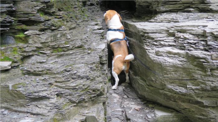 Luna tried exploring a small crevice and discovered she couldn't turn around and finally figured she needed to back out.