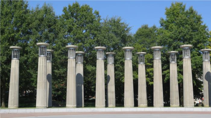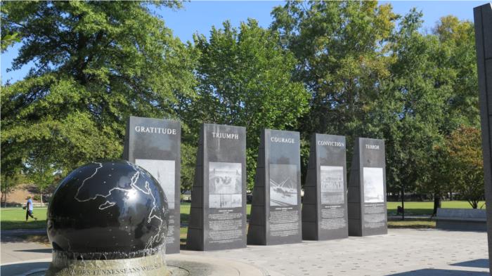 Downtown is the Bicentennial Capitol Mall State Park. The centerpiece is an 18,000-ton black granite globe floating in a thin veneer of water. If you push hard, it will slowly turn for a long time. There is a bench honoring each of the seven Tennessee recipients of the Medal of Honor