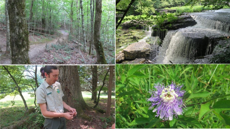Lots of trails to explore and some small waterfalls. Native Americans used this area continuously for about 500 years, eventually leaving it abandoned. By the time European settlers arrived, it was unclear what the area had been used for, which resulted in it being misnamed as a fort. The walls of the "fort" were piled stone covered with earth, enclosing about 50 acres. Radiocarbon dating establishes construction between 200 A.D. and 600 A.D. According to the resident ranger, the Duck River valley is the most biologically diverse river in North America. He led us on a two hour tour of the river basin discussing many of the species of flowers, trees, plants and insects.