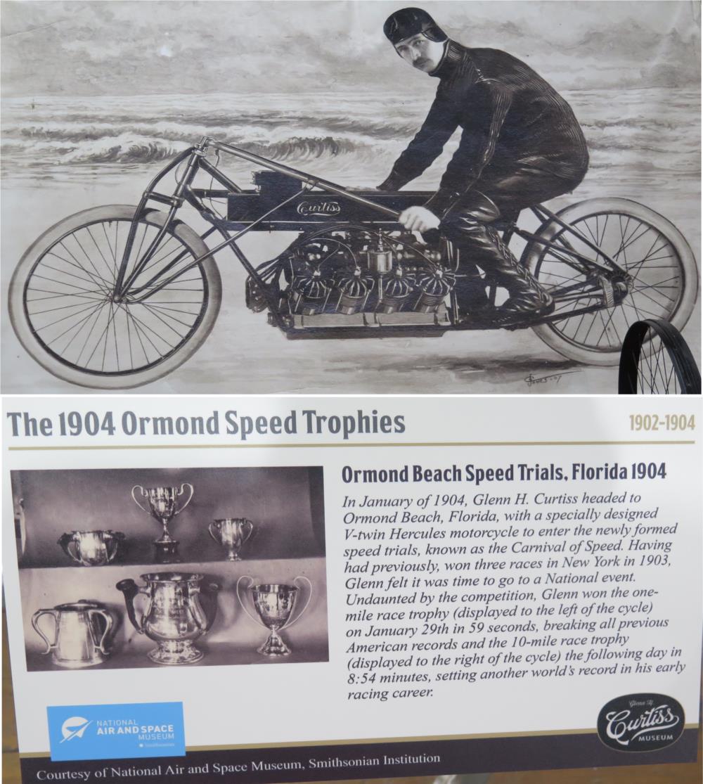 Near Hammondsport, NY is the Glenn H. Curtiss Museum. In addition to numerous displays on his aircraft success, there was an extensive display of motorcycles and Ormond Beach.