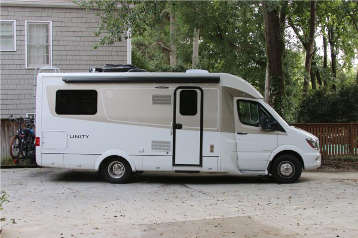 Our RV is a 2019 Leisure Travel Van Unity Twin Bed. It is built on the Mercedes cutaway Sprinter 3500 chassis. It is 25 feet long with no slide-outs.