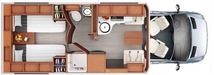 The main reason we chose the Twin Bed model was the ability to separate the interior into two distinct areas and the beds can be reached without climbing over the other person. The wood door in front of the shower can be opened which separates the galley/living room from the bedroom. Also with the Twin Bed model, there are storage cabinets above and under the beds